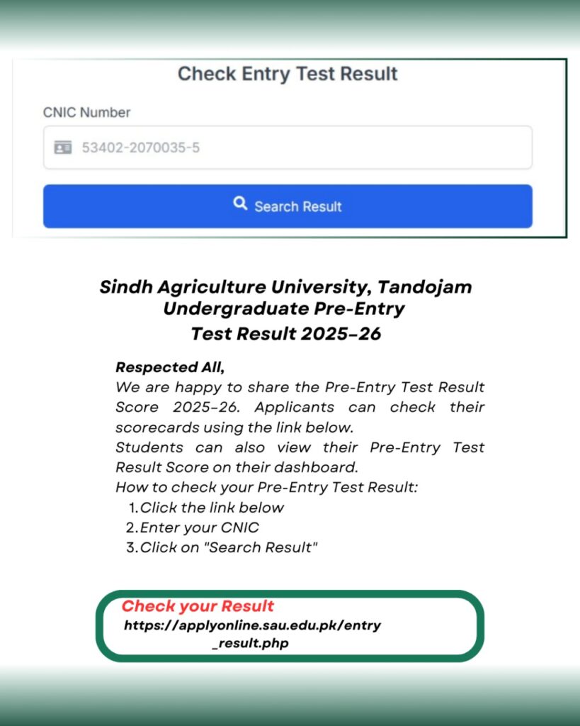 SAU to Conduct Entry Test for Undergraduate Admissions on November 23. Sindh Agriculture University (SAU) Tandojam will conduct the entry test for admissions on Sunday, November 23, for various undergraduate degree programs. The test will be held simultaneously at the Hyderabad, Umerkot, and Khairpur, and Quetta with over 5500 candidates expected to appear, including a significant number of female students.