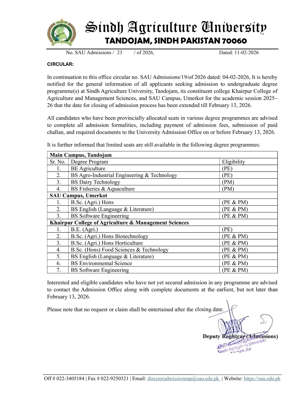 SAU Launches Transparent, Merit-Based Undergraduate Admissions System. Sindh Agriculture University (SAU), Tandojam has introduced a transparent, modern and student-friendly undergraduate admissions system by initiating a structured admission process that enables candidates to select degree programs according to their merit, aptitude and personal preferences. The initiative marks a significant reform in the university’s admission framework. Vice Chancellor Engr Prof Dr Altaf Ali Siyal visited the ongoing admission activities to review the arrangements and personally interacted with students and their parents to obtain feedback on the procedures.