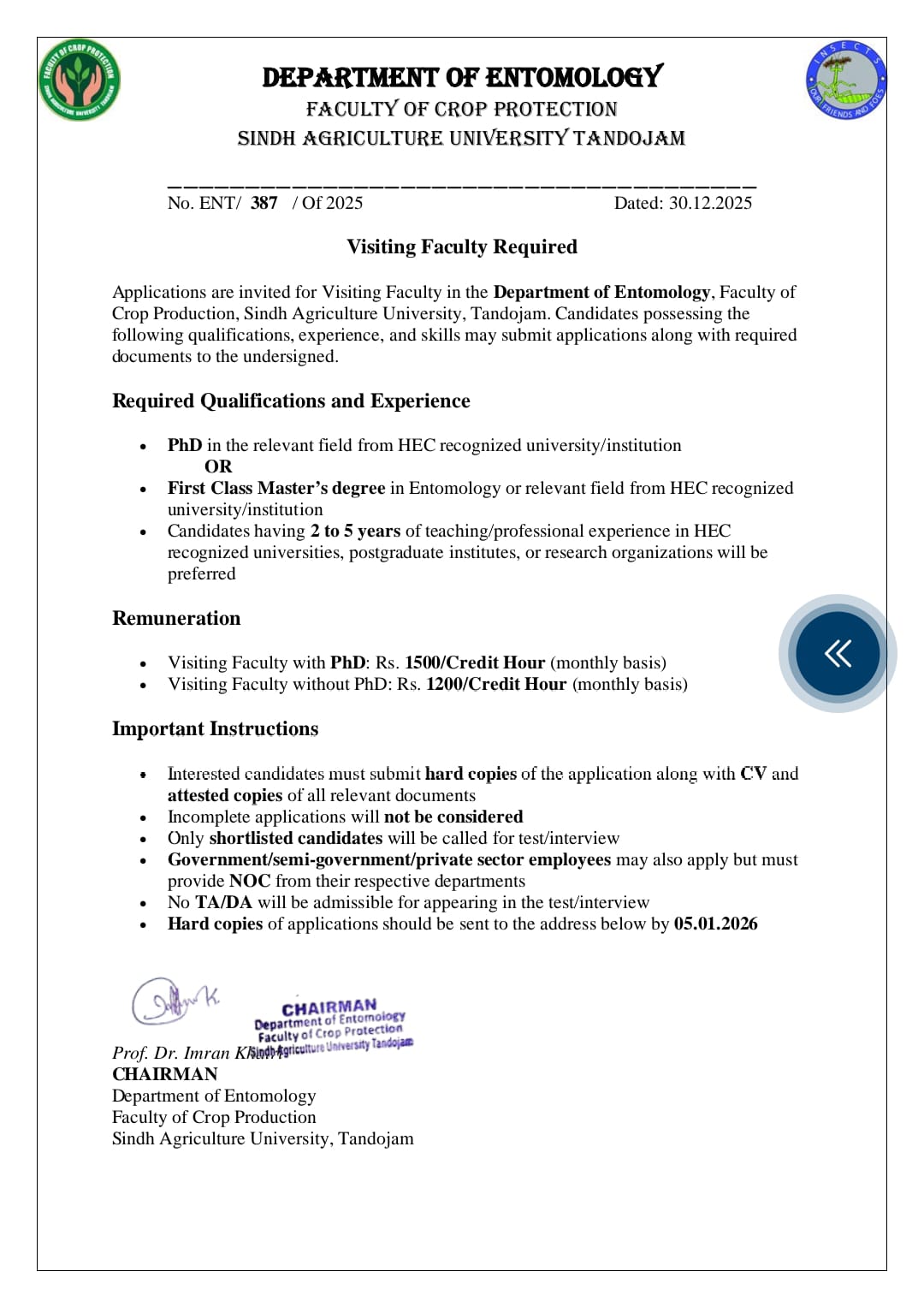 Visiting Faculty Required for the Department of Islamic & Pak/Studies , Faculty of Agricultural Social Sciences. |