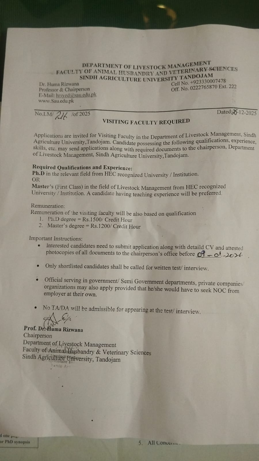 Visiting Faculty Required in the Department of Livestock Management, SAU, Tandojam |