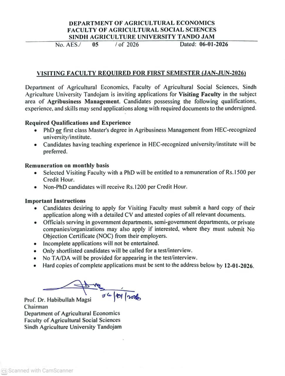 VISITING FACULTY REQUIRED for Faculty in the Department of Animal Products Technology, Sindh Agriculture University, Tandojam. |