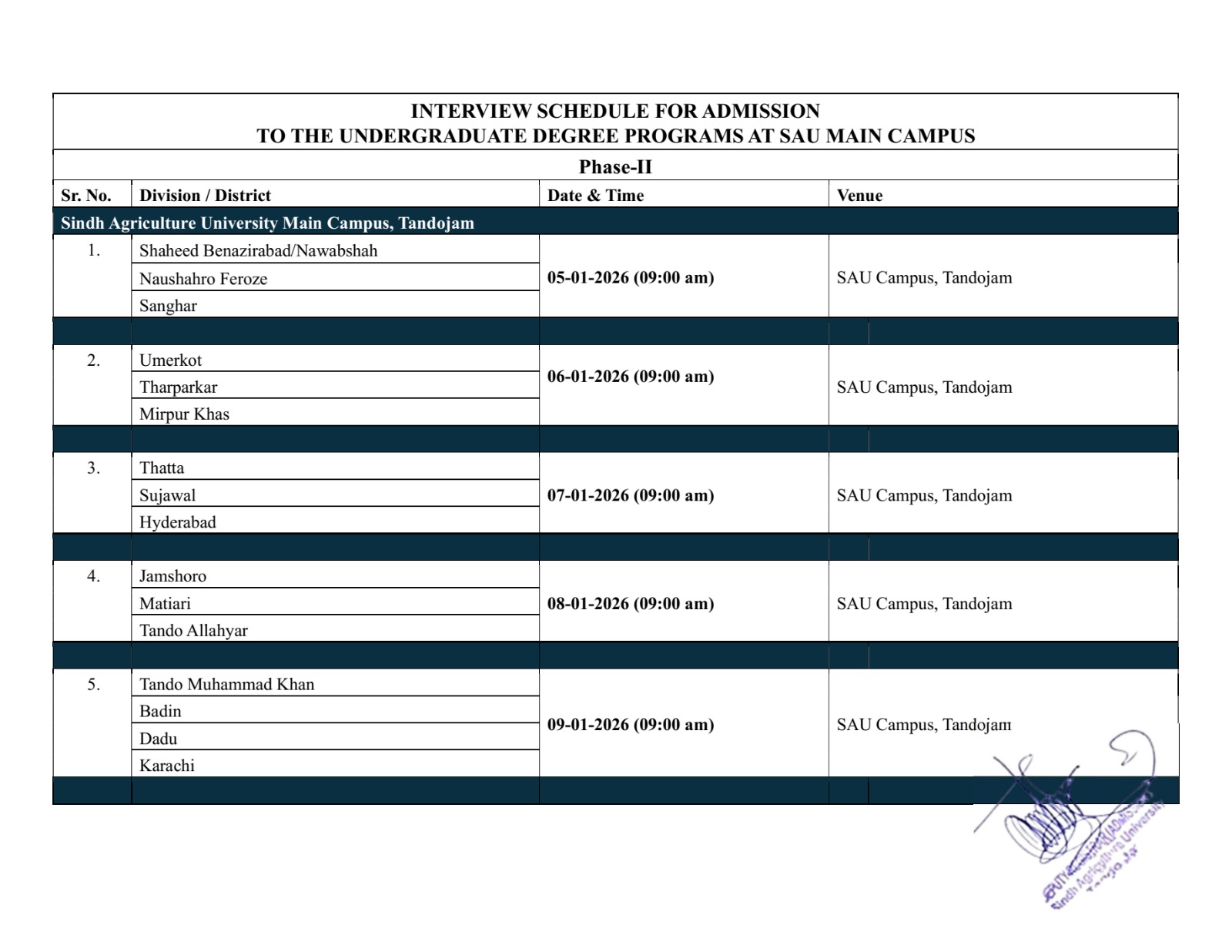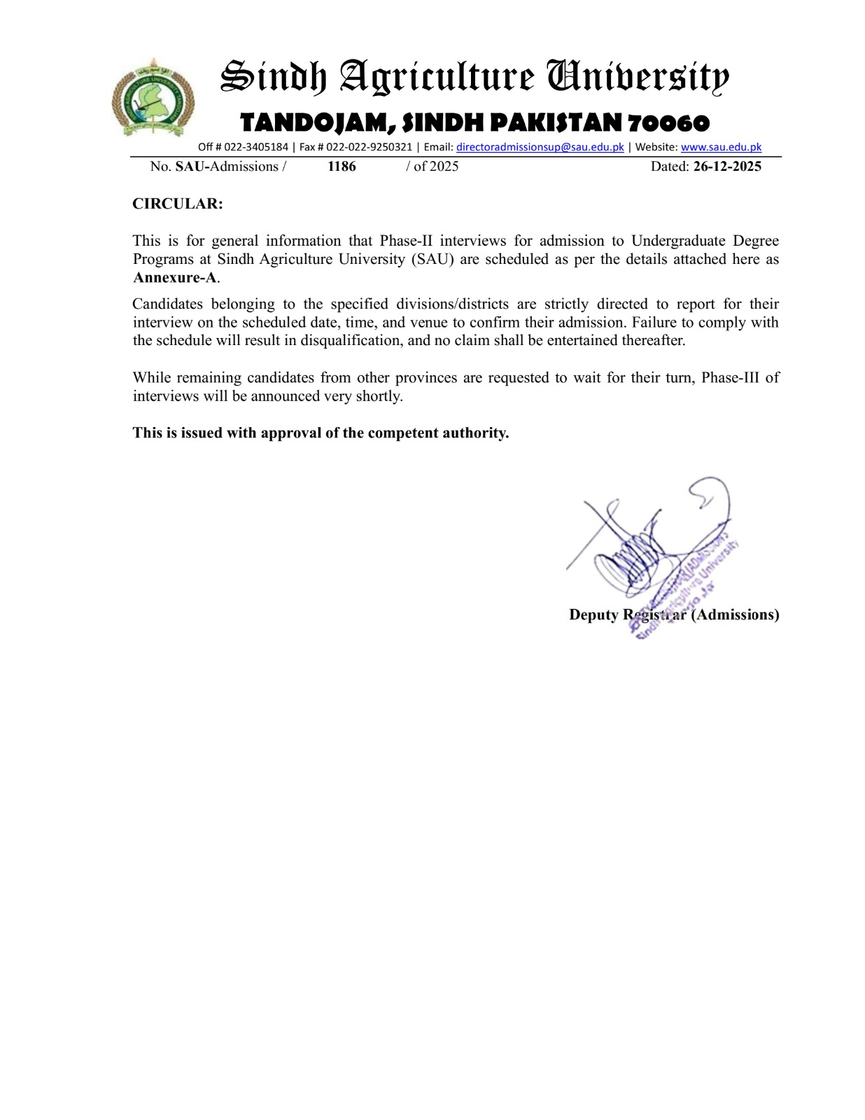 | Phase-I interviews for admission to Undergraduate Degree Programs at Sindh Agriculture University (SAU). including SAU Main Campus, Tandojam; SAU Campus, Umerkot; and Khairpur College of Agriculture & Management Sciences are scheduled.- View Download |